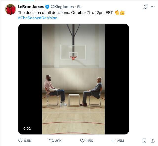 10月7日,湖人巨星詹姆斯在社交媒体发布了一个名为“第二次决定”的短视频。“第二次决定”将在北京时间10月8日0点正式对外公布。关于“第二次决定”是什么内容,并未有明确说